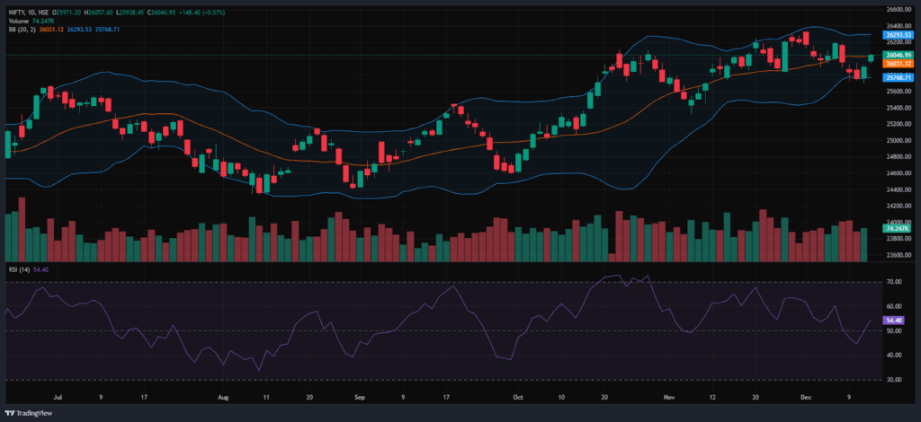 Bollinger Bands (Daily): The index is closed in the upper band of the Bollinger Band range above the middle band. Its position in the upper range suggests a bullish sentiment in the short term. On Friday, the Index formed a Strong bullish candlestick pattern after taking support near 25,950, featuring a small upper wick and a long lower wick. It consistently held above the 26,000 mark and hovered around 26,050 for most of the session. A sustained move above the middle band signals a bullish sentiment, while a drop back toward the lower band may reinforce bearish sentiment.