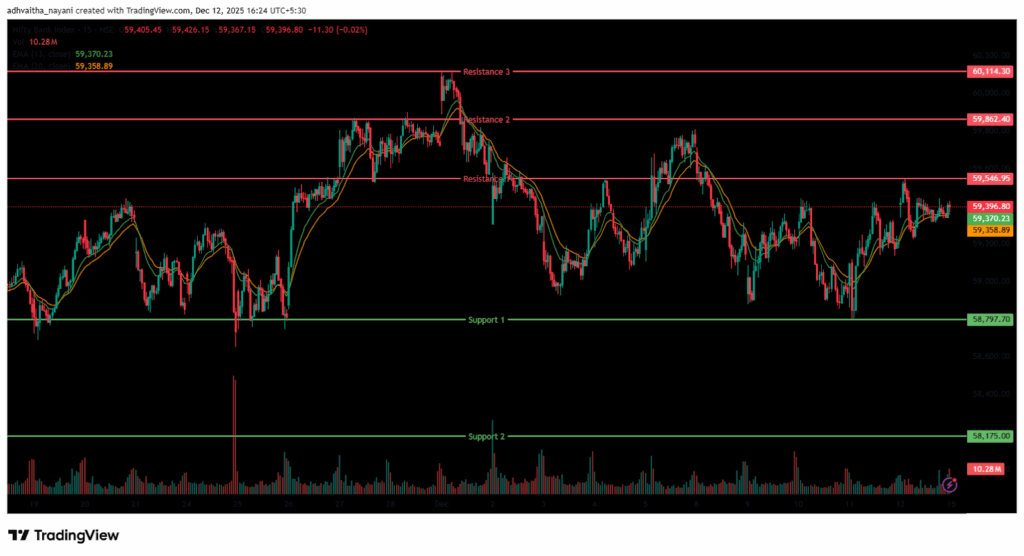 In the afternoon session, the index dipped slightly to the 59,300 level and finally settled near the 59,390 mark. Overall, it was trading between the levels of 59,300 and 59,400. Finally, it had closed at 59,389.95 on a positive note, up 180.10 points or 0.30%. The Relative Strength Index (RSI) stood at 58.20, below the overbought zone of 70 in the daily time frame. In the daily time frame, the Index closed above the 13- and 20-day EMA, indicating a bullish outlook in the near term and formed a doji candlestick pattern, indicating indecision.