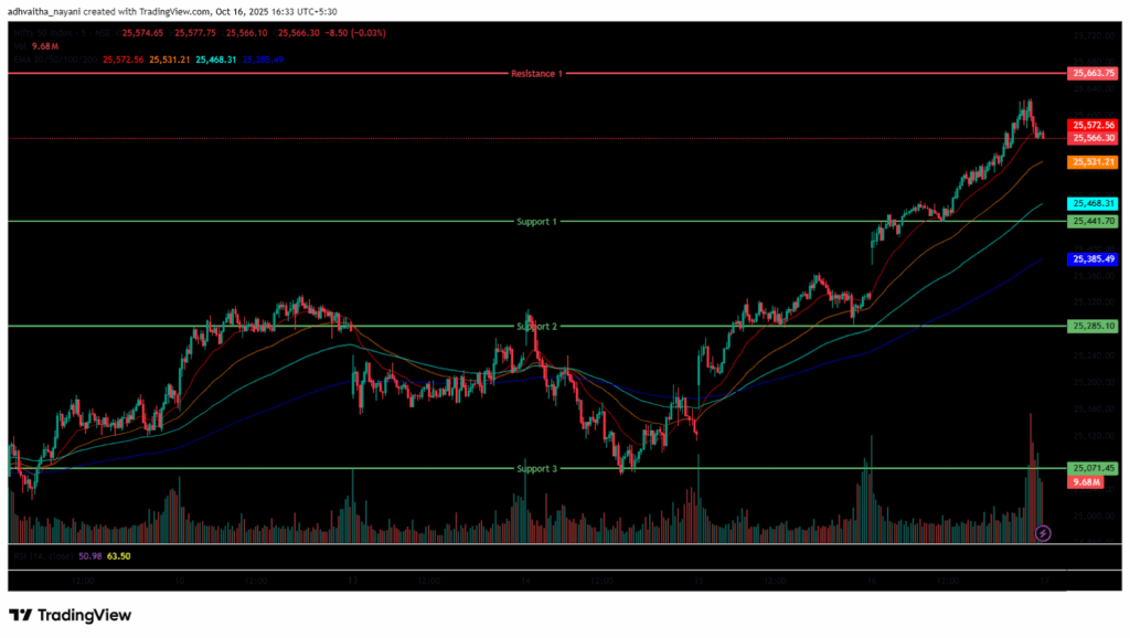 During the afternoon session, the Nifty 50 closed above all four EMAs of 20/50/100/200 in the 15-minute time frame. The Nifty 50 is trading near its 52-week high of 25,669.35. The Nifty’s immediate resistance level is at 25,663.75, while immediate support levels are S1 (25,441.7), S2 (25,285.1), and S3 (25,071.45).