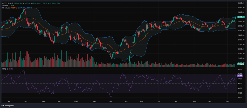 Bollinger Bands (Daily): The index is trading in the upper band of the Bollinger Band range above the middle band (Simple Moving Average). Its position in the upper range indicates a bullish sentiment, and the Index took support near the 25,350 and 25,600 acted as a resistance level. A sustained move above the middle band signals a bullish sentiment, while a drop back toward the lower band may reinforce bearish sentiment.