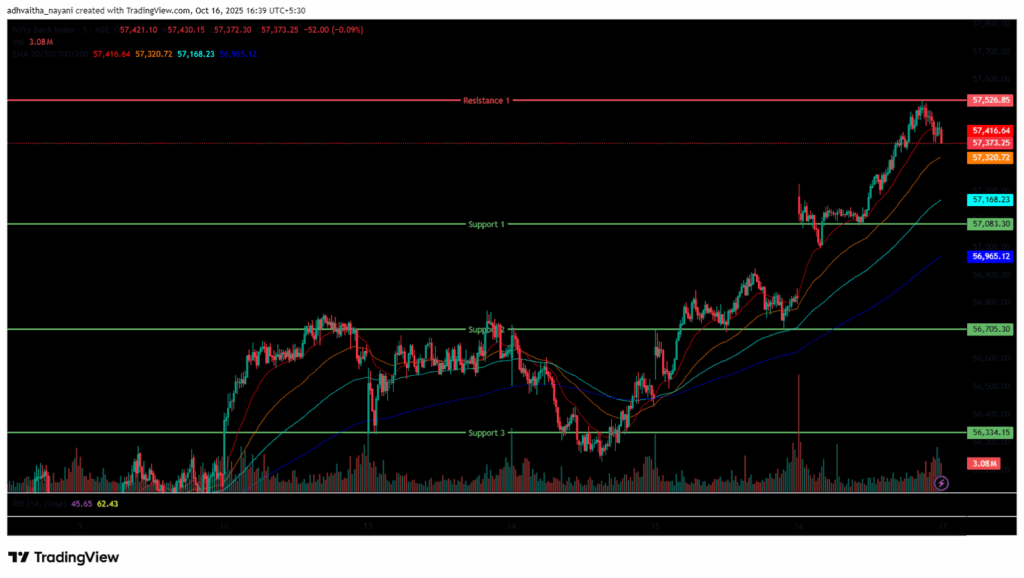 Further, the Index was trading in the range of 57,250 and 57,500, and ended in green above its opening level. During the afternoon session, Bank Nifty closed above all four EMAs of 20/50/100/200 in the 15-minute time frame. The Bank Nifty’s immediate resistance level is at 57,526.85, while its immediate support levels are S1 (57,083.3), S2 (56,705.3), and S3 (56,334.15).