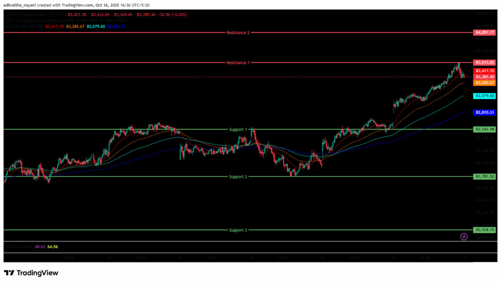 In the afternoon session, the Index continued to rise and was trading around 83,200 and 83,600, maintaining its overall bullish trend and closing above the EMAs of 20/50/100/200 in the 15-minute time frame. The BSE Sensex immediate resistance levels are R1 (83,614) and R2 (84,098), while immediate support levels are S1 (82,543), S2 (81,782), and S3 (80,929).