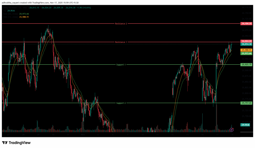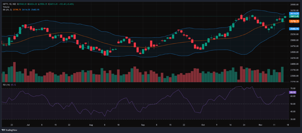 Bollinger Bands (Daily): The index is trading in the upper band of the Bollinger Band range (Simple Moving Average). Its position in the upper range suggests a bullish sentiment, and in Monday’s session, the Index formed a bullish candle with minimal wicks on the upper end and a long wick on the lower end. The close is above the open, confirming upward momentum. The index took support near 25,906, and 26,024 acted as a resistance level. A sustained move above the middle band signals a bullish sentiment, while a drop back toward the lower band may reinforce bearish sentiment.
