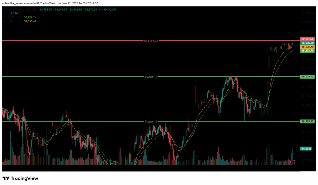 The Bank Nifty Index opened on a positive note at 58,696.30 on Monday, up by 178.75 points from Friday’s closing of 58,517.55. The index opened on an optimistic note but traded in a range-bound manner in the morning session, between the 58,800 and 58,975 levels. In the afternoon session, the index continued to trade near the 59,000 level, marking its day high at 59,001.55 and trading between the range of 58,920 and 59,000.