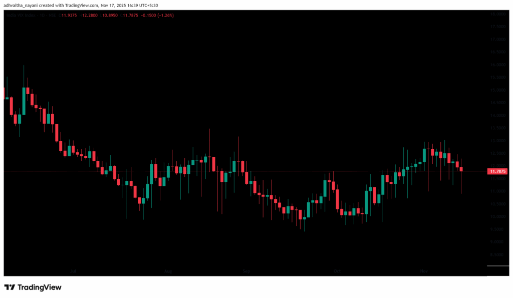 The India VIX decreased 0.15 points or 1.26%, from 11.94 to 11.79 during Monday’s session. A decrease in the India VIX typically indicates lower price volatility in the stock market, suggesting a more stable market environment. However, a stable market environment and minimal volatility are anticipated when the India VIX is below 15.