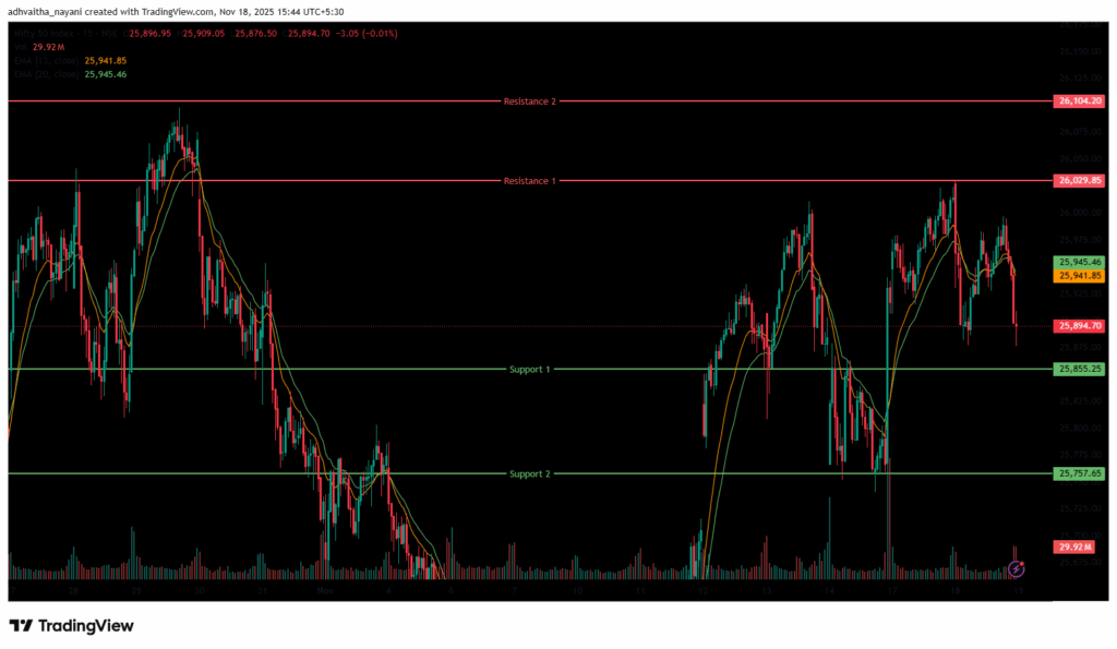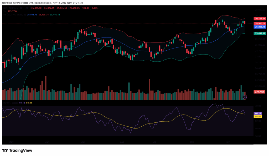 Bollinger Bands (Daily): The index is trading in the upper band of the Bollinger Band range (Simple Moving Average). Its position in the upper range suggests a bullish sentiment in the near term. However, on Tuesday’s session, the Index formed a bearish candle. The index took support near 25,900, and 26,000 acted as a resistance level. A sustained move above the middle band signals a bullish sentiment, while a drop back toward the lower band may reinforce bearish sentiment.