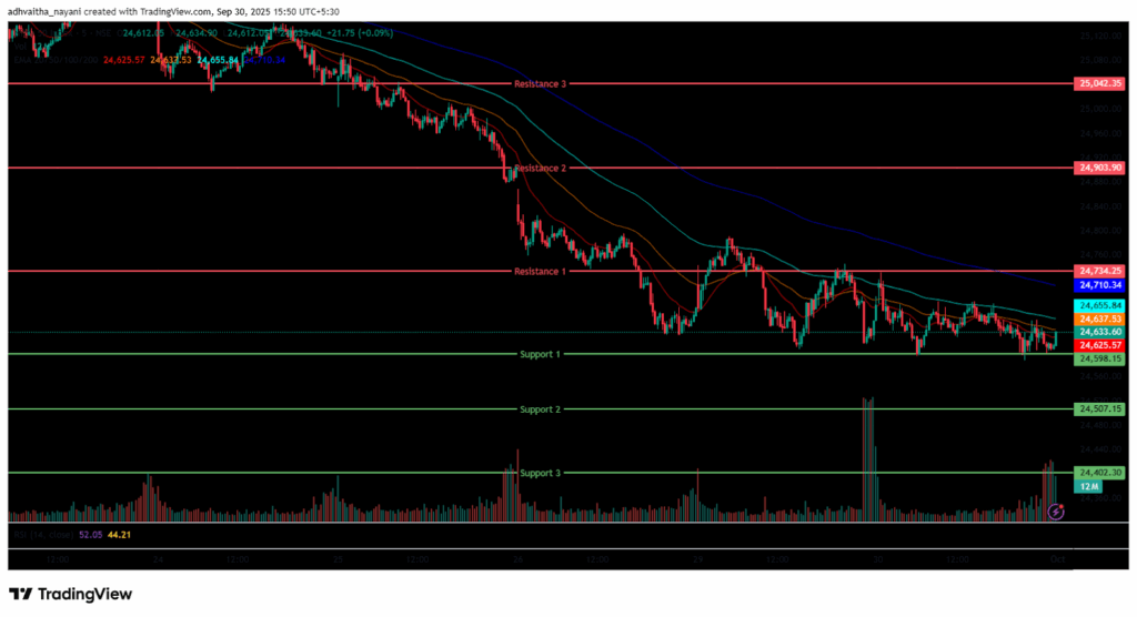 Further, the index lost its momentum and fell as low as the 24,588 mark, the day’s low in the afternoon session, and was traded below its opening level, between the range of 24,550 and 24,650. During the afternoon session, the Nifty 50 traded below all four EMAs of 20/50/100/200 in the 15-minute time frame. Nifty’s immediate resistance levels are R1 (24,734), R2 (24,904), and R3 (25,042), while immediate support levels are S1 (24,598), S2 (24,507), and S3 (24,402).