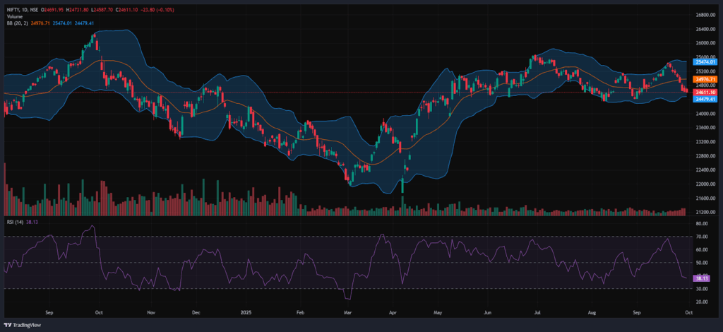 Bollinger Bands (Daily): The index is trading in the lower band of its Bollinger Band range below the middle band (Simple Moving Average). Its position in the lower range indicates a bearish sentiment, along with strong resistance around the 24,650 level in Tuesday’s session. A sustained move above the middle band signals a bullish sentiment, while a drop back toward the lower band may reinforce bearish sentiment.