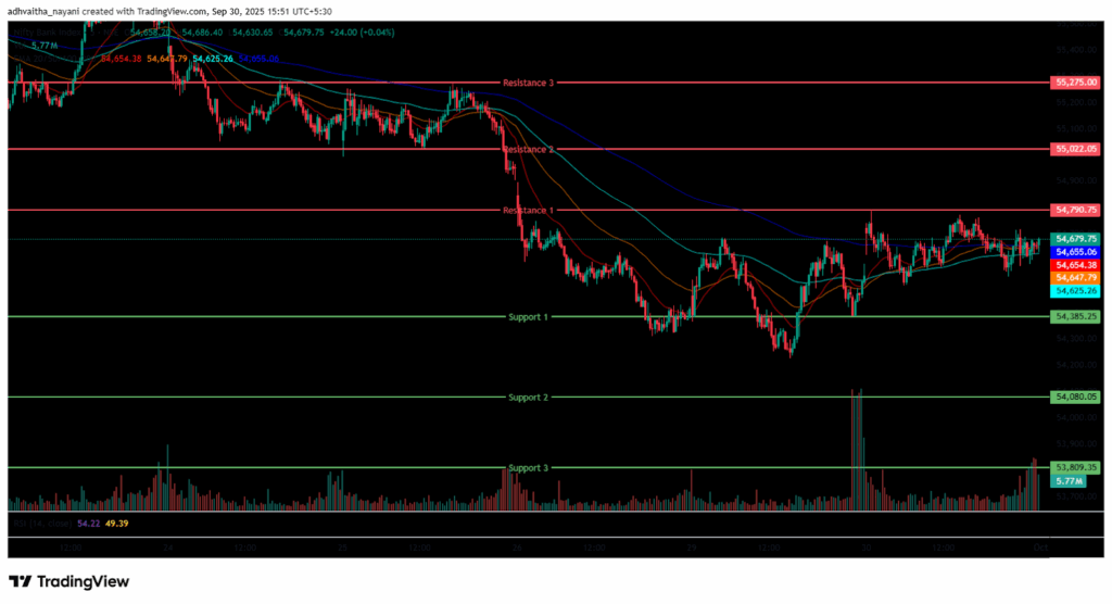In the afternoon session, the Index lost its momentum and fell as low as the 54,538 level and was traded around the range of 54,500 and 54,700, ending in green. During the afternoon session, Bank Nifty closed below the EMAs of 100/200 but above the 20/50-period EMA in the 15-minute time frame. Bank Nifty immediate resistance levels are R1 (54,791), R2 (55,022), and R3 (55,275), while immediate support levels are S1 (54,385), S2 (54,080), and S3 (53,809).
