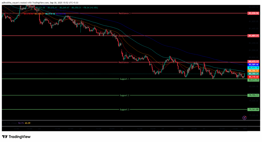 In the afternoon session, the Index traded in a range bound between 80,200 and 80,500, maintaining its overall bearish trend and closing below all four EMAs of 20/50/100/200 in the 15-minute time frame. BSE Sensex immediate resistance levels are R1 (80,672), R2 (81,408), and R3 (82,031), while immediate support levels are S1 (80,212), S2 (79,755), and S3 (79,362).
