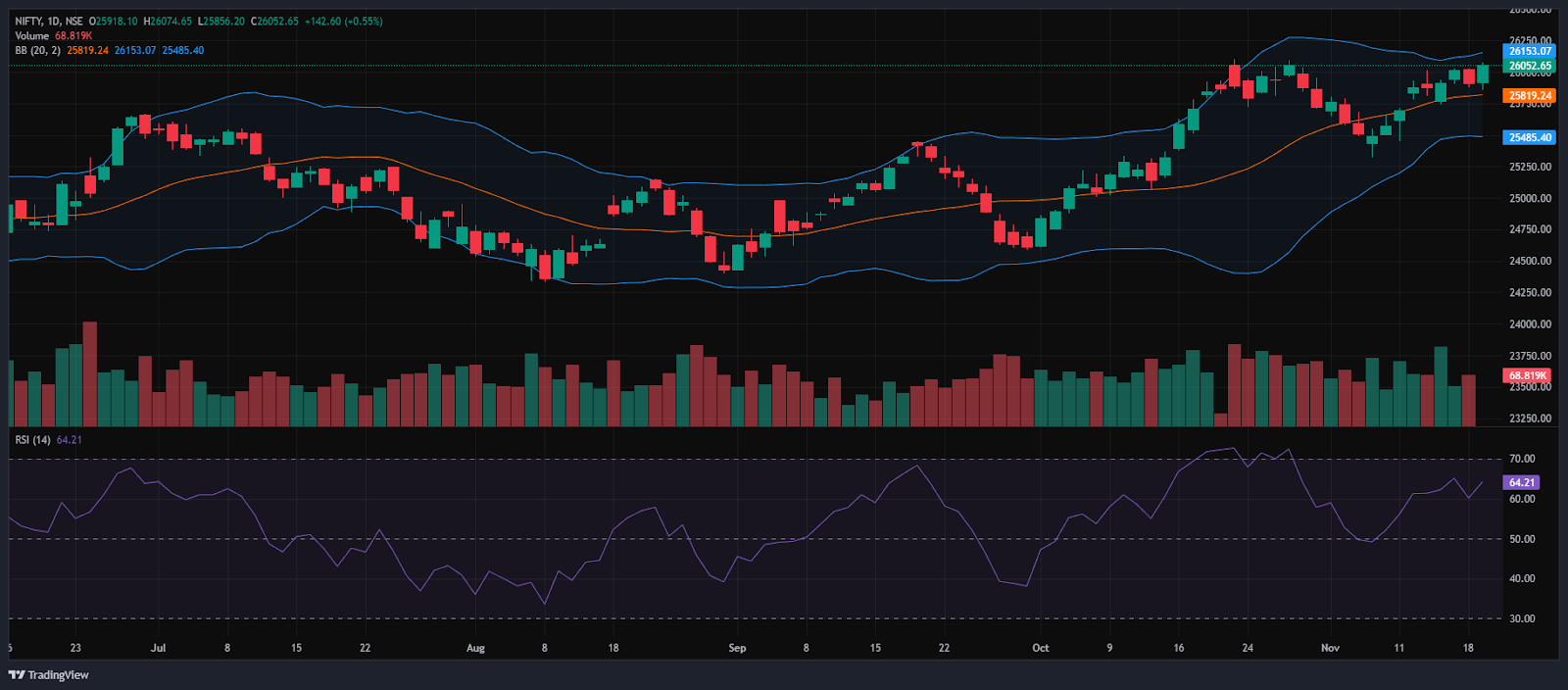 Bollinger Bands (Daily): The index is trading in the upper band of the Bollinger Band range (Simple Moving Average). Its position in the upper range suggests a bullish sentiment and in Wednesday’s session, the Index formed a large bullish candle with minimal wicks on both ends and ended on a bullish note. The index took support near 25,856, and 26,075 acted as a resistance level. A sustained move above the middle band signals a bullish sentiment, while a drop back toward the lower band may reinforce bearish sentiment.