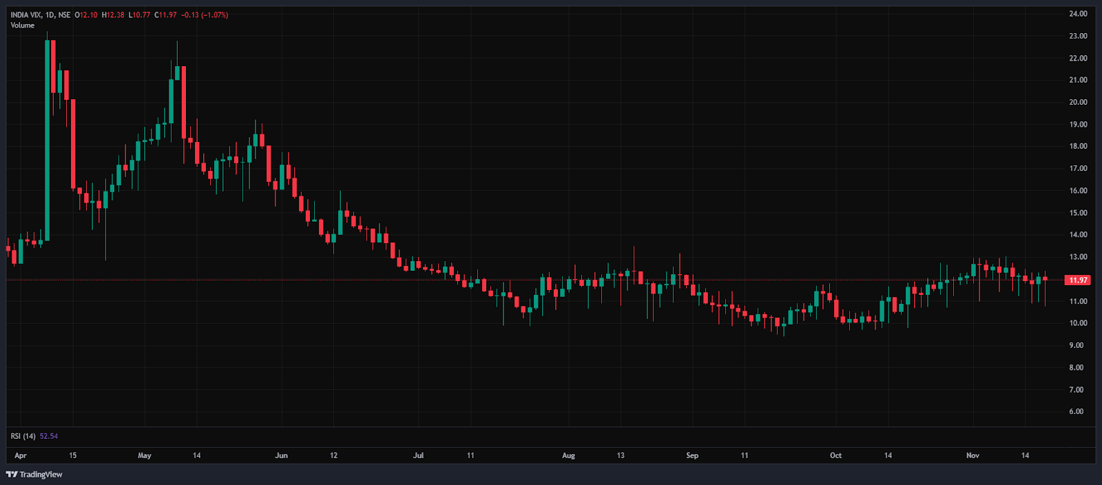 The India VIX decreased 0.13 points or 1.07%, from 12.10 to 11.97 during Wednesday’s session. A decrease in the India VIX typically indicates lower price volatility in the stock market, suggesting a more stable market environment. However, a stable market environment and minimal volatility are anticipated when the India VIX is below 15.