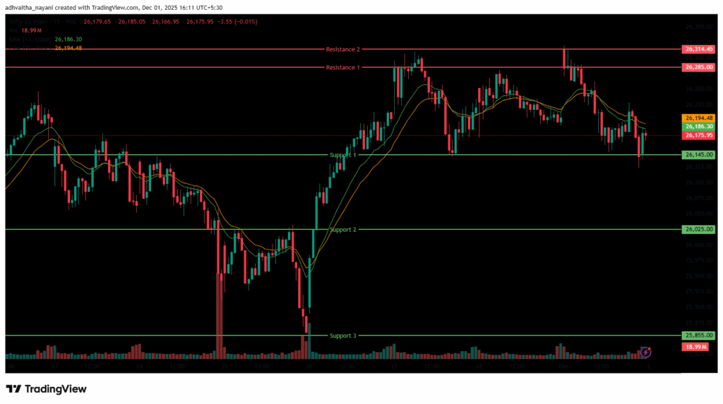 On Monday, the Nifty 50 opened slightly higher at 26,325.80, up by 122.85 points from its previous close of 26,202.95. The index hit an intraday high of 26,325.80 and closed above the 26,100 level at 26,175.75, down -27.20 points, or -0.10%. The index closed above all key moving averages (20/50/100/200-day EMAs) on the daily chart.
