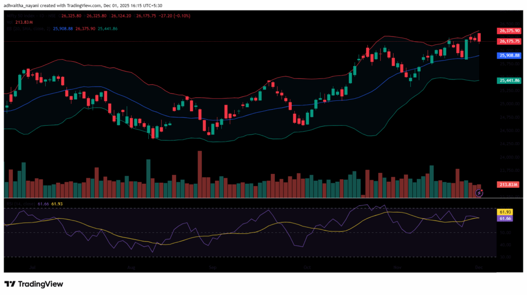 Bollinger Bands (Daily): The index is comfortably trading in the upper band of the Bollinger Band range. Its position in the upper range suggests a bullish sentiment in the short term. However, on Monday’s session, the Index formed a relatively weak bullish candlestick pattern, with no upper wick, and a longer lower wick, with a red body, reflecting indecision and weakness in upward momentum. The index fell below the 26,200 level on Monday’s session. A sustained move above the middle band signals a bullish sentiment, while a drop back toward the lower band may reinforce bearish sentiment.