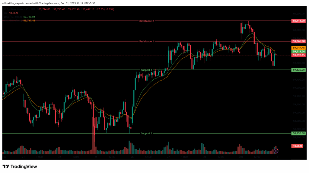 The nearest resistance is at 59,866.60 (R1) and 60,114.30 (R2), which is the all-time high for the index. On the other hand, the closest support is now at 59,520 (S1), and the next support is at 58,750 (S2), where the index has taken support at this level previously. If the index falls below this, the next major support level to watch is at 58,175 (S3).