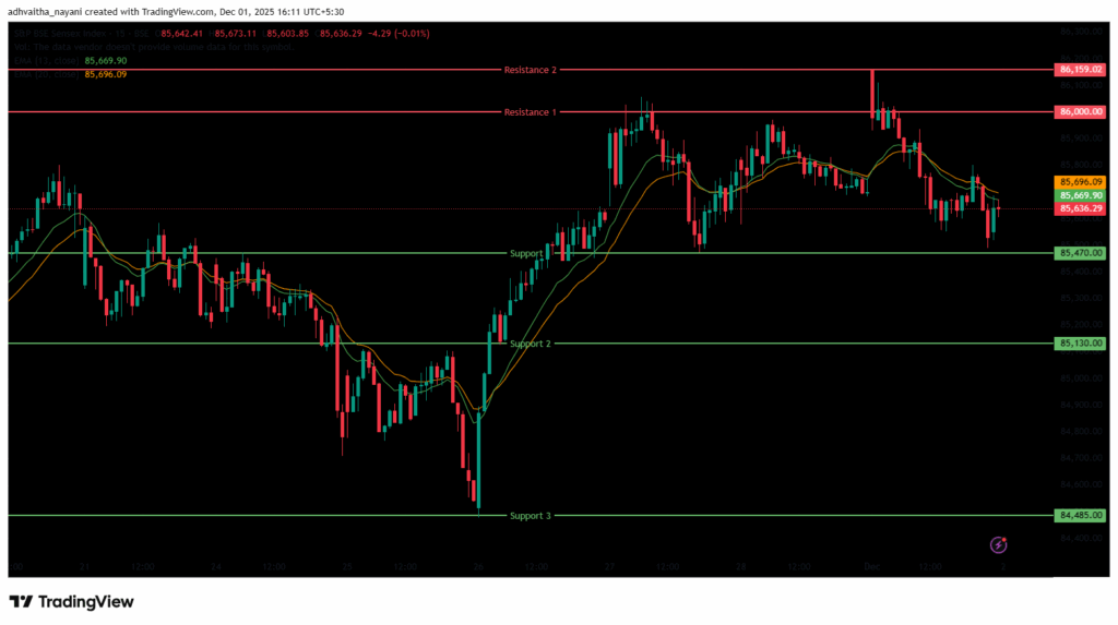 The index faces immediate resistance at 86,000 (R1) and 86,159.02 (R2), a level near its all-time high. On the downside, support lies at 85,470 (S1), which was previously resistance and now acts as support; the next one is at 85,130 (S2), where the index has taken support previously. Whereas the next support level (S3) is at 84,485.