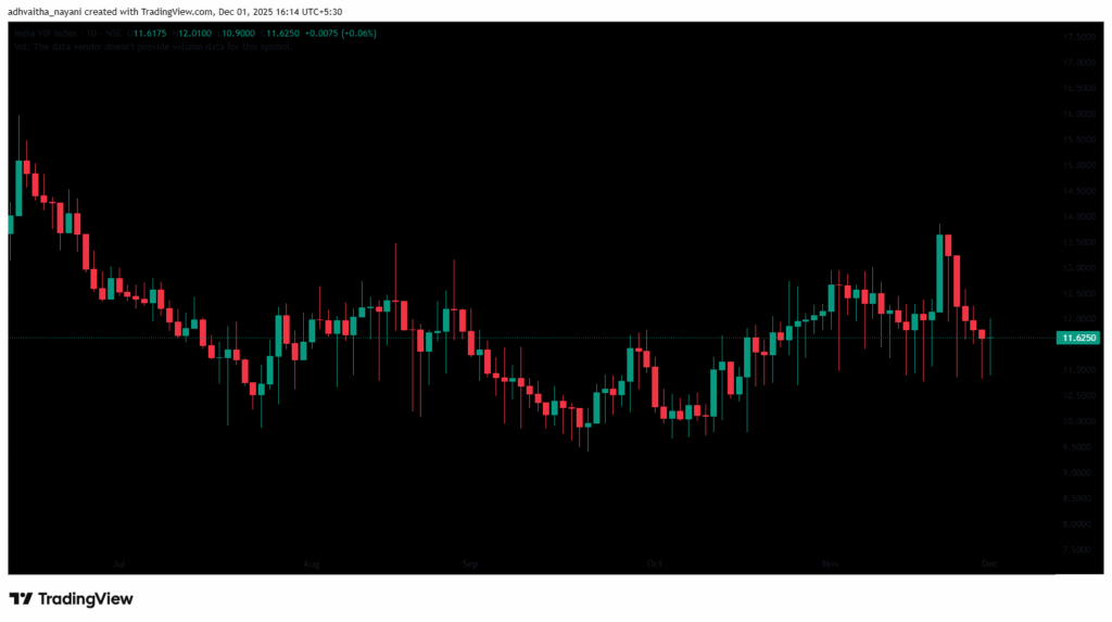 The India VIX was flat at 11.625, up by 0.0075 points (0.06%) during Monday’s trading session, indicating neutral sentiment in expected market volatility. However, overall volatility remains low, since the India VIX is generally considered elevated only when it rises above 15.