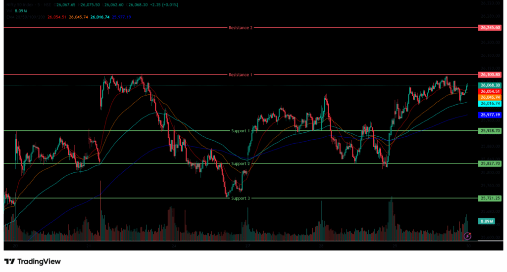 The Nifty 50 Index opened on a positive note at 25,982.00 on Wednesday, up by 45.8 points from Tuesday’s closing of 25,936.20. The index opened on a bullish note and surged above the 26,000 level in the morning session. During the morning session, the index traded within the 25,950-26,100 range, staying above all four EMAs (20/50/100/200) on the 15-minute chart.