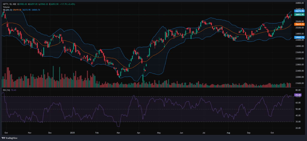Bollinger Bands (Daily): The index is trading in the upper band of the Bollinger Band range above the middle band (Simple Moving Average). Its position in the upper range indicates a bullish sentiment, and the Index formed a bullish candle in the daily time frame after an indecision candle formed in the previous session and took support near 25,960 and 26,098 acted as a resistance level. A sustained move above the middle band signals a bullish sentiment, while a drop back toward the lower band may reinforce bearish sentiment.