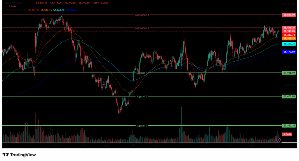 The Bank Nifty Index started the session on a positive note at 58,316.25 on Wednesday, up by 102.15 points from Tuesday’s closing of 58,214.10. The index started on a Bullish note, but dragged down to the 58,087 level, marking its day low and was trading in the range of 58,050-58,400. In addition, the index was trading above all four EMAs of 20/50/100/200 in the 15-minute time frame in the morning session.