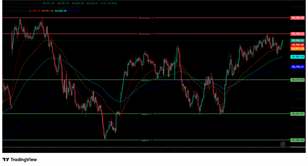 In the afternoon session, the Index continued its bullish momentum and surged as high as 85,105, marking its day high. The Index was trading in the 84,850-85,150 range, maintaining its overall bullish trend and closed above all four EMAs of 20/50/100/200 in the 15-minute time frame. The BSE Sensex immediate resistance levels are R1 (85,109) and R2 (85,283), while immediate support levels are S1 (84,611), S2 (84,241), and S3 (83,956).
