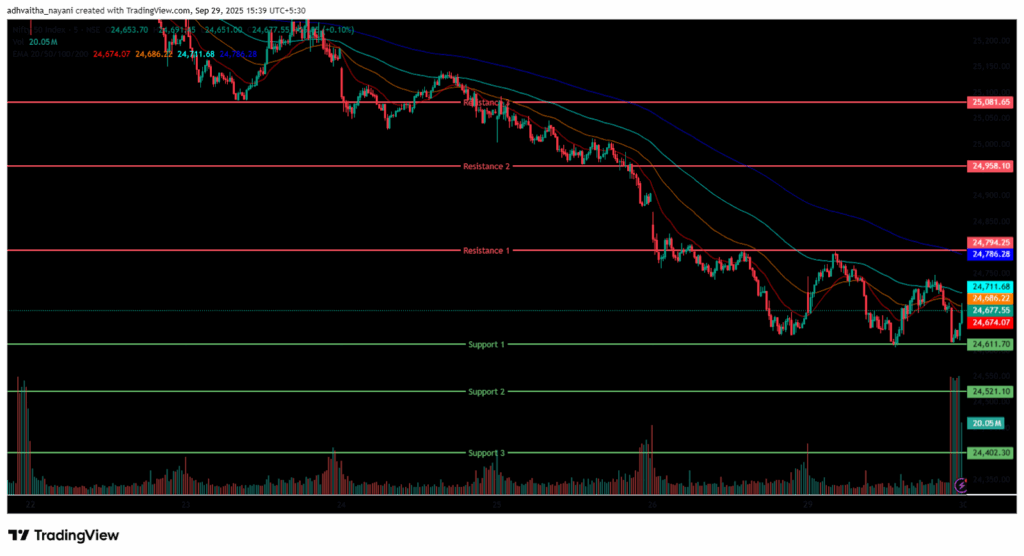 The Nifty 50 Index opened on a positive note at 24,728.55 on Monday, up by 73.85 points from Friday’s closing of 24,654.70. With a bullish start to the day, the index had a volatile morning session, trading in the 24,600 to 24,800 range. Additionally, the Index stood below all four EMAs of 20/50/100/200 in the 15-minute time frame during the morning session.