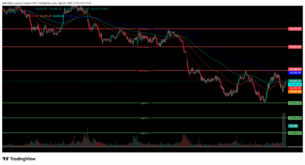 In the afternoon session, the Index further fell as low as the 54,227 level, marking its day’s low and was traded around the range of 54,200 and 54,700, ending in green. During the afternoon session, Bank Nifty closed below the EMAs of 50/100/200 but above the 20-period EMA in the 15-minute time frame. Bank Nifty immediate resistance levels are R1 (54,689), R2 (55,022), and R3 (55,275), while immediate support levels are S1 (54,231), S2 (54,022), and S3 (53,809).