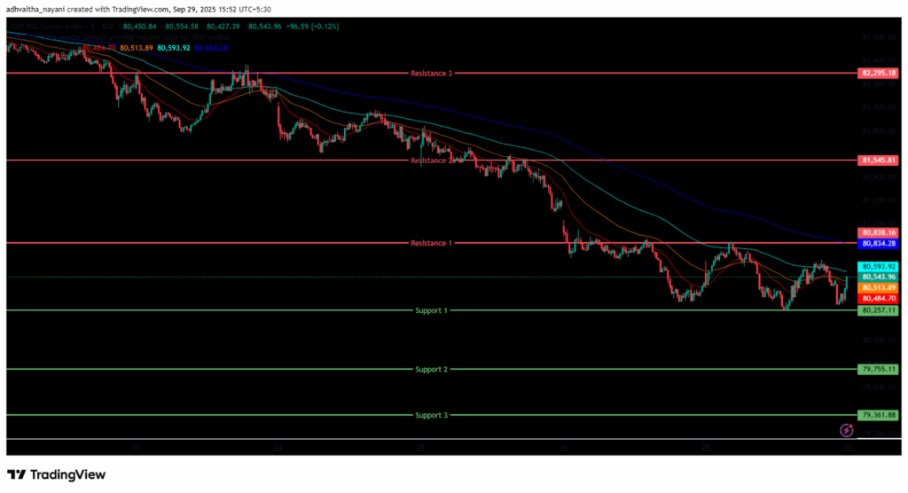 In the afternoon session, the Index was further dragged down, marking its day low at the 80,249 level and trading between the 80,200 and 80,700 levels, maintaining its overall bearish trend and closing below the EMAs of 50/100/200 but above the 20 period EMA in the 15-minute time frame. BSE Sensex immediate resistance levels are R1 (80,838), R2 (81,546), and R3 (82,295), while immediate support levels are S1 (80,257), S2 (79,755), and S3 (79,362).
