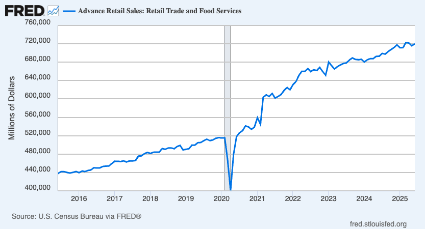 On Thursday, we learned monthly retail sales grew 0.6% in June to $720 billion. This metric is hovering near record highs.