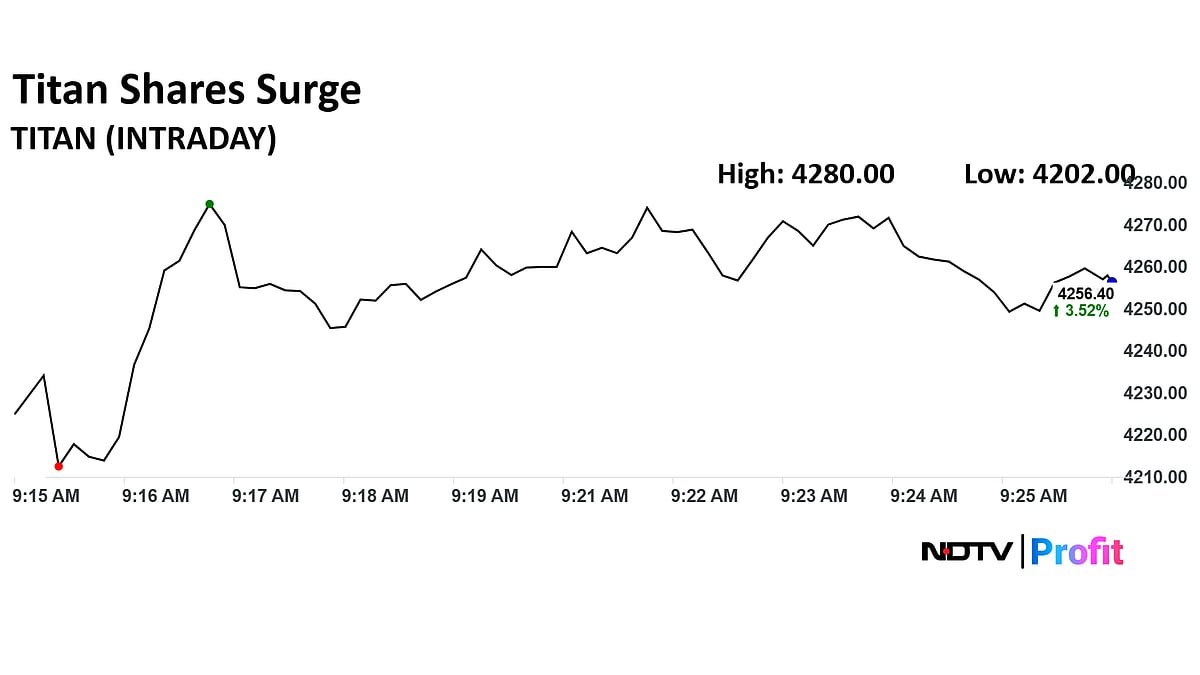 Shares of Titan Co Ltd. surged 4% on Wednesday with the stock currently hitting lifetime high. The stock is currently trading at Rs 4256.40 apiece. The stocks are bullish after the company shared its robust quarterly updates on Tuesday.
