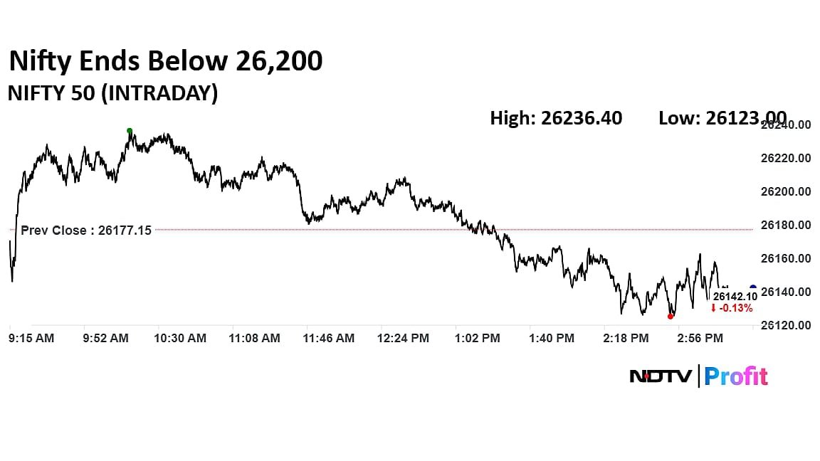 The Indian equity benchmarks settled lower on Wednesday, with Nifty 50 ending 35.05 points or 0.13% lower at 26,142.10 and Sensex ending 137.16 points or 0.16% down at 85,387.68. During the day both benchmarks had risen 0.20%.
