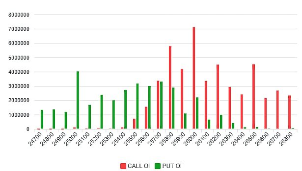 “On the downside, 25,600-25,550 would act as key support zones, while 25,900-25,950 could be the key resistance areas for the bulls. However, below 25,550, the sentiment could change and the same traders may prefer to exit out from trading long positions,” said Shrikant Chouhan, head equity research at Kotak Securities.