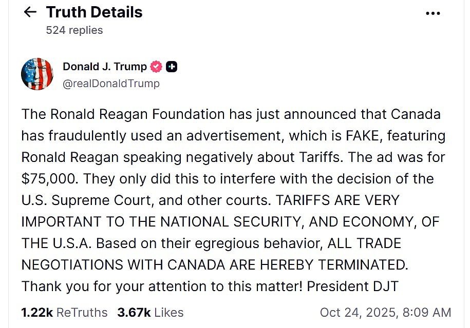 “The Ronald Reagan Foundation has just announced that Canada has fraudulently used an advertisement, which is FAKE, featuring Ronald Reagan speaking negatively about Tariffs. The ad was for $75,000. They only did this to interfere with the decision of the U.S. Supreme Court, and other courts. TARIFFS ARE VERY IMPORTANT TO THE NATIONAL SECURITY, AND ECONOMY, OF THE U.S.A. Based on their egregious behavior, ALL TRADE NEGOTIATIONS WITH CANADA ARE HEREBY TERMINATED. Thank you for your attention to this matter! President DJT,” Trump wrote on his social media platform.