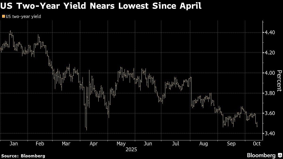 Yields on two-year US Treasuries fell as much as four basis points to 3.47%, near the lowest level since April, as trading resumed after a holiday. European government debt mirrored the moves, while gilts outperformed as rising UK unemployment fueled wagers on rate reductions.