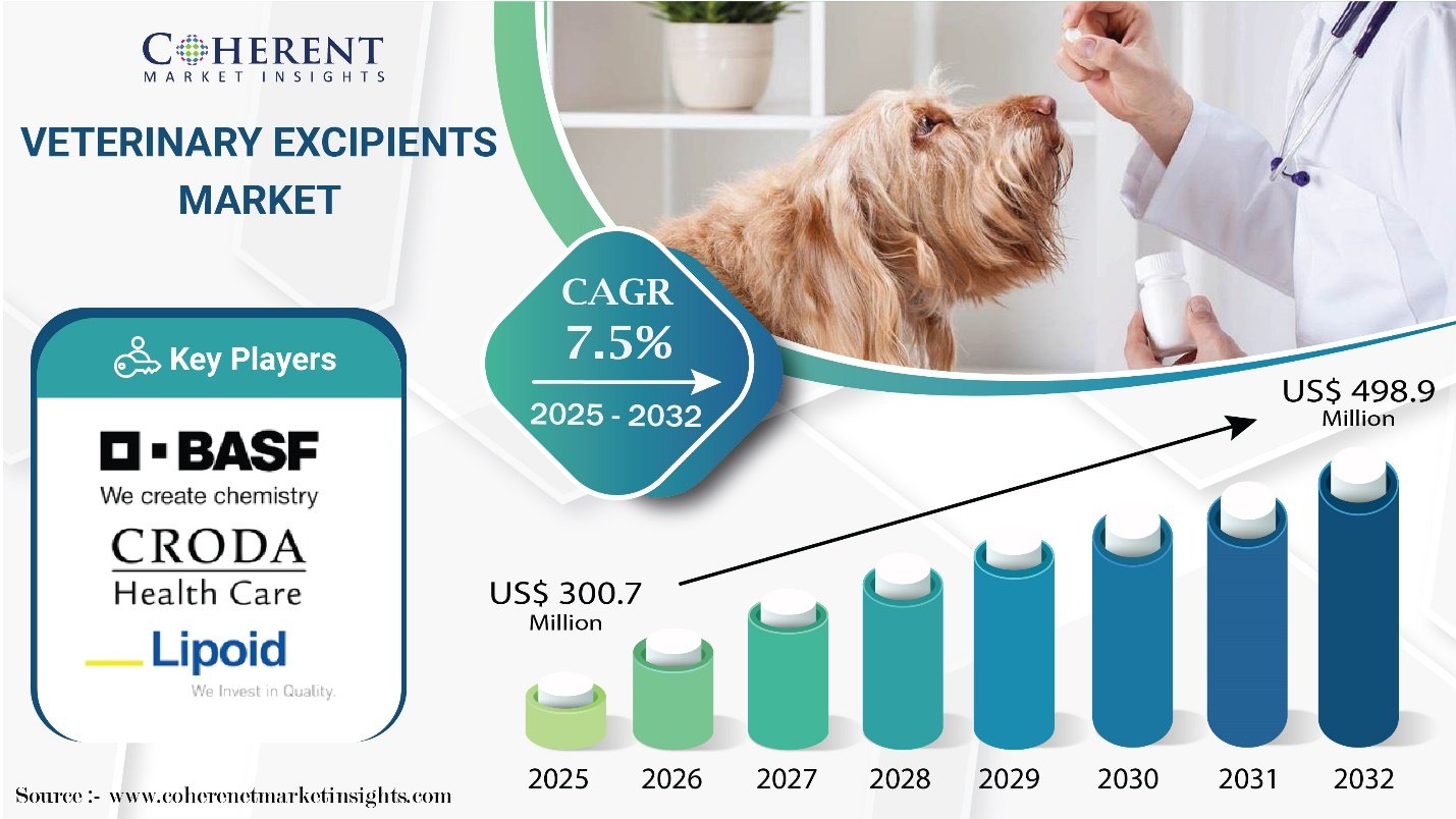 Burlingame, CA, Oct. 01, 2025 (GLOBE NEWSWIRE) — According to Coherent Market Insights (CMI), the global Veterinary Excipients Market is estimated to be valued at USD 300.7 Mn in 2025 and is expected to reach USD 498.9 Mn in 2032, exhibiting a compound annual growth rate (CAGR) of 7.5% from 2025 to 2032. Rising pet ownership, coupled with the growing livestock population, is fueling the demand for improved treatment options for animals, thereby driving the adoption of animal healthcare products. This trend is anticipated to propel market growth throughout the forecast period.