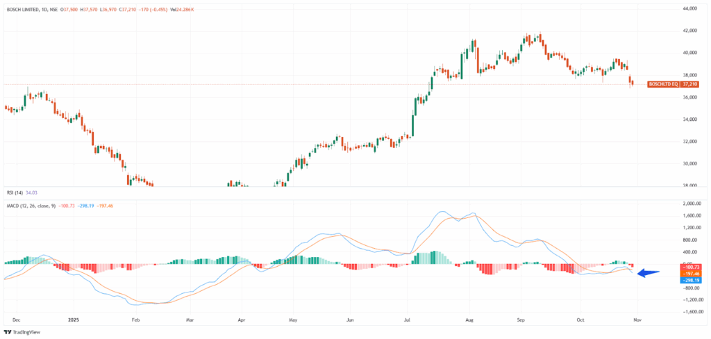 With market capitalization of Rs. 1,09,746 cr, the shares of Bosch Ltd are closed at Rs. 37,210 per share, from its previous close of Rs. 37,380 per share. This stock has seen a MACD bearish crossover, signaling a potential weakening in bullish momentum and suggesting short-term downside risk.