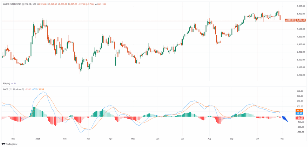 With market capitalization of Rs. 28,552 cr, the shares of Amber Enterprises India Ltd are closed at Rs. 8,085.50 per share, from its previous close of Rs. 8,085.50 per share. This stock has seen a MACD bearish crossover, signaling a potential weakening in bullish momentum and suggesting short-term downside risk.