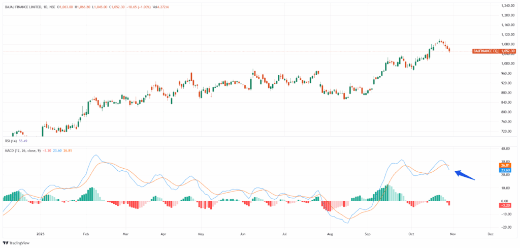 With market capitalization of Rs. 6,54,574 cr, the shares of Bajaj Finance Ltd are closed at Rs. 1,052.30 per share, from its previous close of Rs. 1,062.95 per share. This stock has seen a MACD bearish crossover, signaling a potential weakening in bullish momentum and suggesting short-term downside risk.