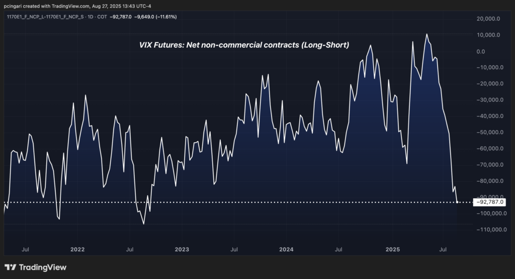 According to the latest Commitment of Traders (COT) report, non-commercial traders held net short positions of -92,787 VIX futures contracts as of Aug. 19. That’s the most aggressive bet against volatility in nearly three years.