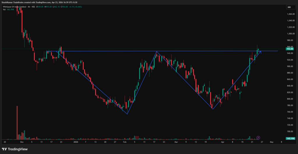 The stock has successfully broken above its neckline resistance and is sustaining above it, reflecting underlying strength. On Thursday, Whirlpool of India Ltd moved past the double-bottom neckline resistance on the 4-hour chart, confirming the pattern with consistent buying volumes. Holding above the Rs 946 support level indicates positive near-term momentum and opens the door for further upside.
