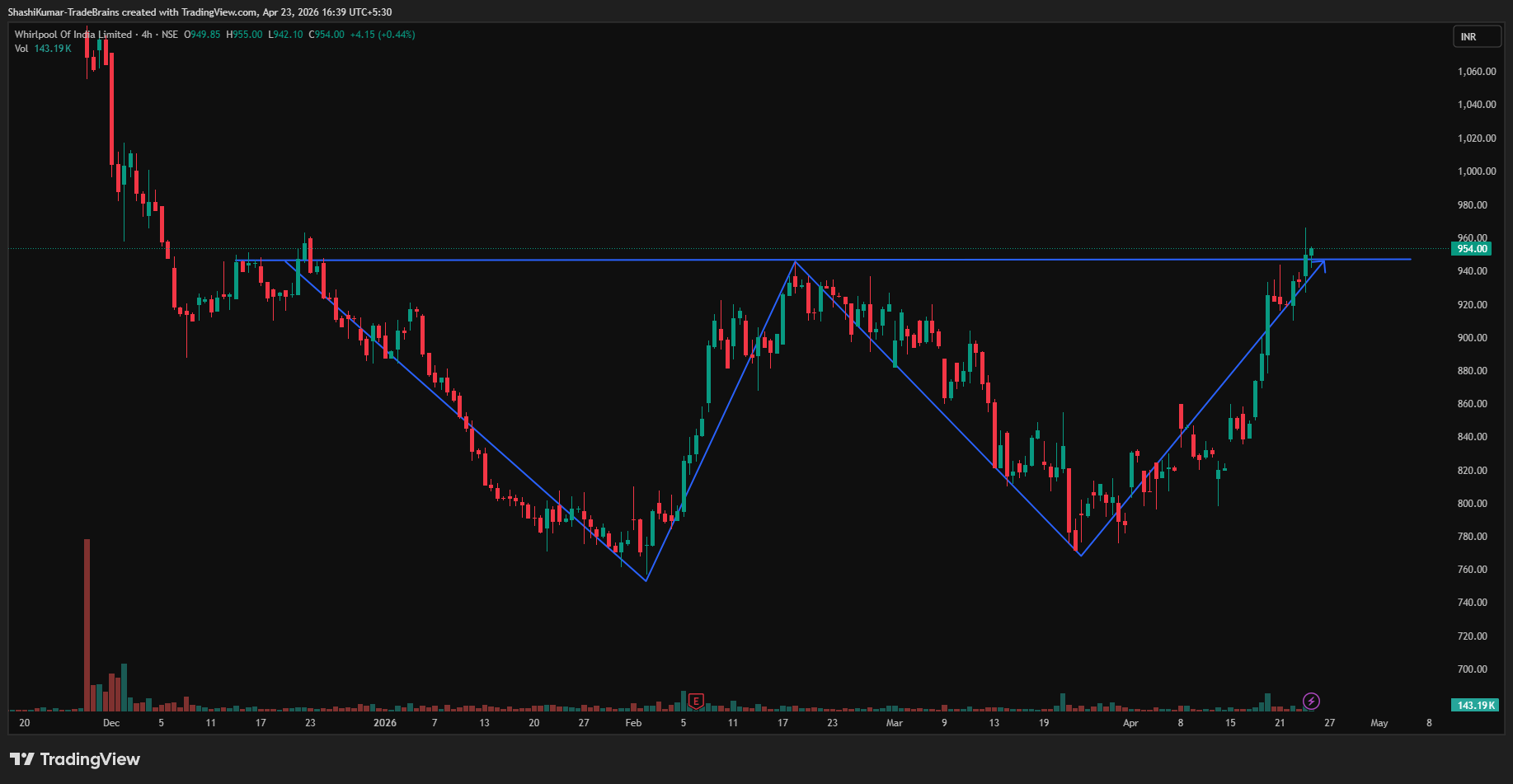 Synopsis: Whirlpool of India Ltd has formed a double-bottom pattern on the 4-hour chart, indicating a possible short-term bullish reversal.